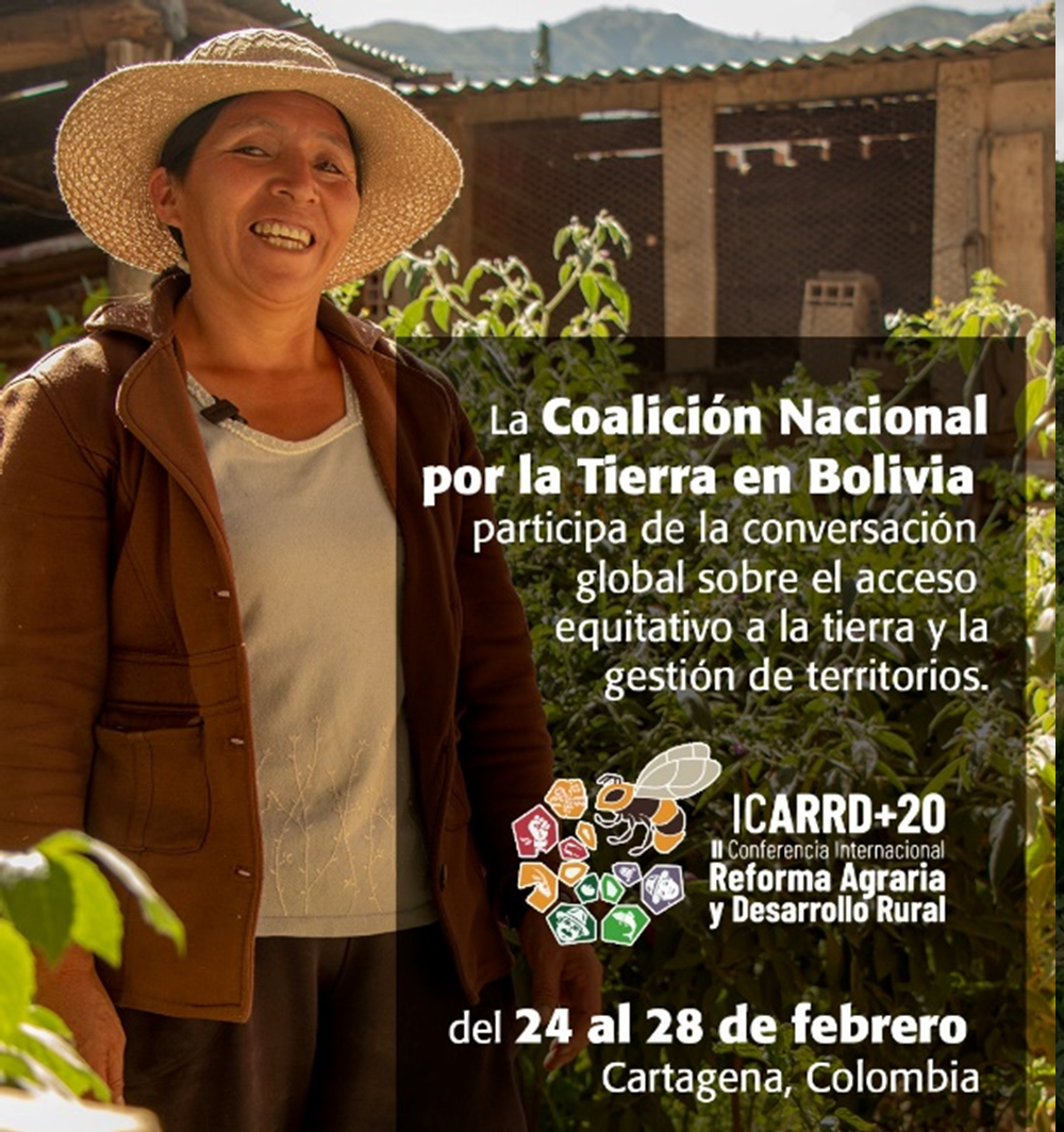 La Coalición Nacional por la Tierra de Bolivia (CNT Bolivia) presentará el panel “Reforma agraria y autodeterminación, la experiencia boliviana”, el día 25 de febrero en Cartagena, Colombia, sede de la Veinteava versión de la ICARRD, a fines del mes de febrero de este año. El IPDRS, la Fundación Tierra, CEJIS y CENDA contribuirán con su experiencia y apuesta por el horizonte de autodeterminac...