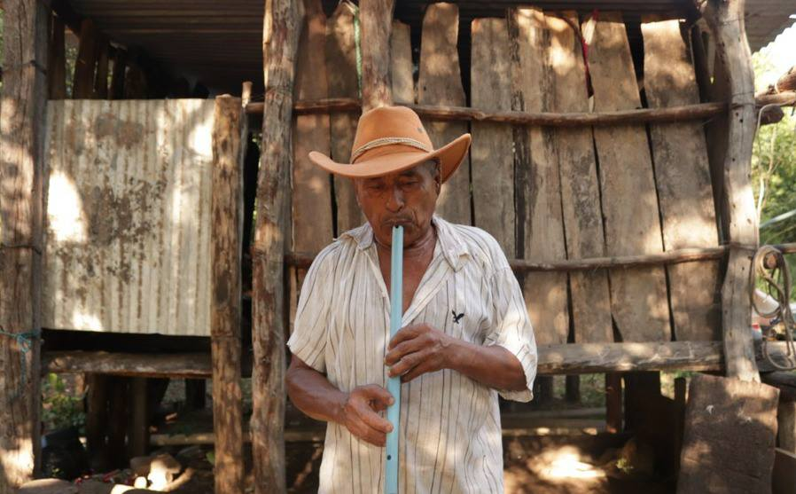 Músico de Los Arakae, Luis Arroyo, ensayando con su flauta.