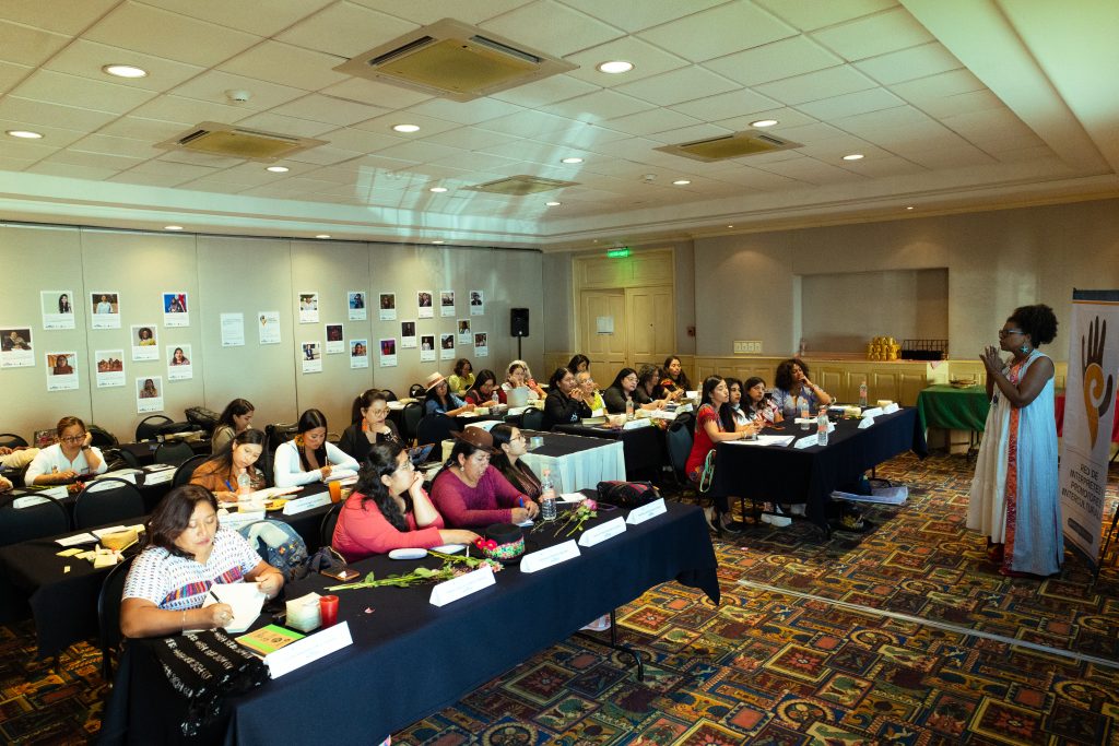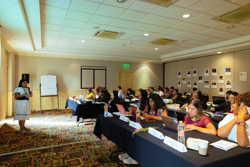 Continuamos con las historias que inspiran, cuatro mujeres luchadoras contaron sus experiencias territoriales. Liliana Hernández, mujer indígena guanana Katiria Majsa de Mitú, Vaupés, habló de su formación como líder comunitaria y juvenil, que fortalece procesos sociales y políticos, promoviendo derechos de la juventud y mujeres indígenas. Inés Josseline Guaman, mujer indígena Kichwa – Kañari de Gampalá y Gun Chico Canton suscal de ecuador, comentó sobre su formación como abogada y maestra en derecho constitucional, activista en derechos humanos y educación y derecho sobre pluralismo. Brenda Leticia Saloj, mujer Maya Kadchikel de solola, activista en derechos humanos educación, liderazgo, equidad, justicia ambiental y climática y asesora de los pueblos indígenas ha representado a Guatemala en el Foro Global de juventudes indígenas en Roma. Desde Bolivia, nuestra compañera Juana Guari, subcoordinadora del IPDRS Amazonía, mujer indígena tacana de la comunidad Sinaí que lucha día a día para salir adelante, participó de proyectos con comunidades indígenas y campesinas fortaleciendo los derechos de las mujeres y el desarrollo territorial. En ese proceso, “me insta a enfrentar y luchar por la justicia climática en mi comunidad y me asumo como líder de mujeres para unir fuerzas y defender el territorio”.